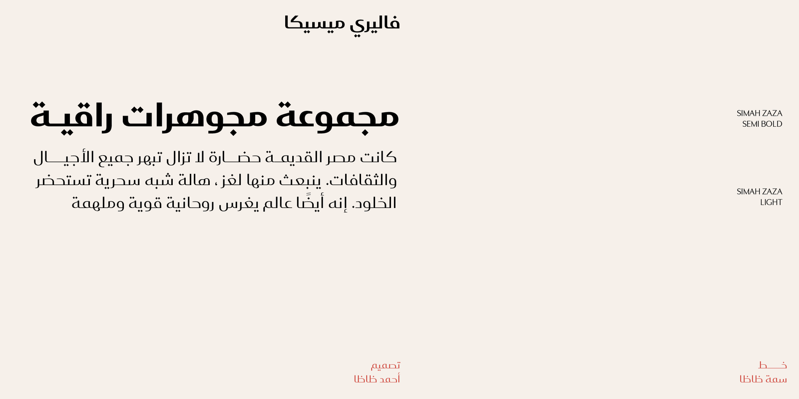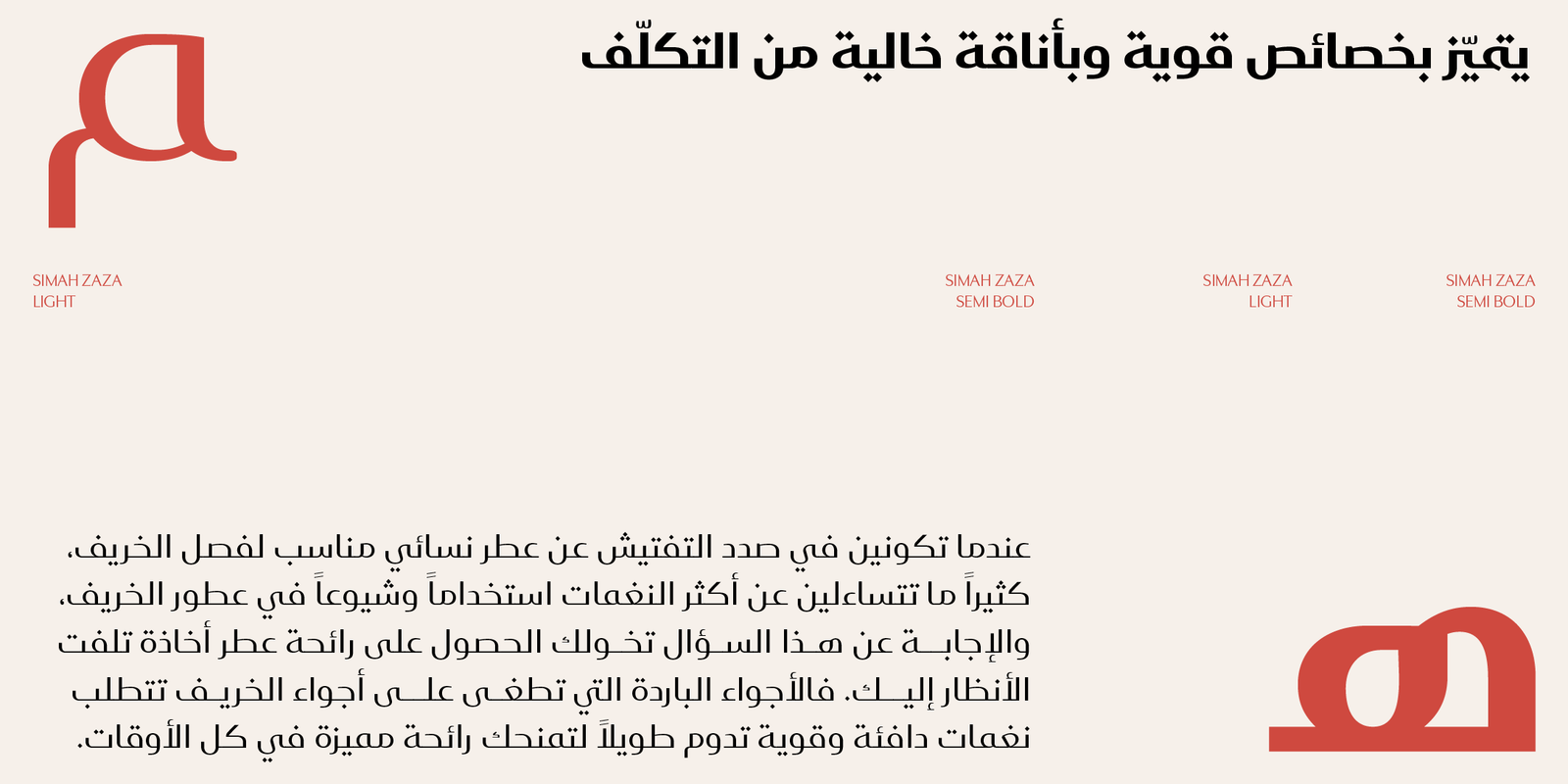 خط سمة ظاظا هو خط عربي يجمع بين الفخامة والدفء مع لمسة إنسانية فريدة، مما يجعله خيارًا مثاليًا لتصميم طباعي عربي حديث وخطوط عربية معاصرة. يتميز الخط بالوضوح والمرونة والبساطة، مما يجعله معاصرًا ومناسبًا للاستخدامات المتنوعة. مستوحى من الخط الكوفي ومُتأثر بأسلوب النسخ، تم تصميم سمة ظاظا بعناية فائقة لضمان أدائه الممتاز سواء على الشاشات أو في الطباعة.