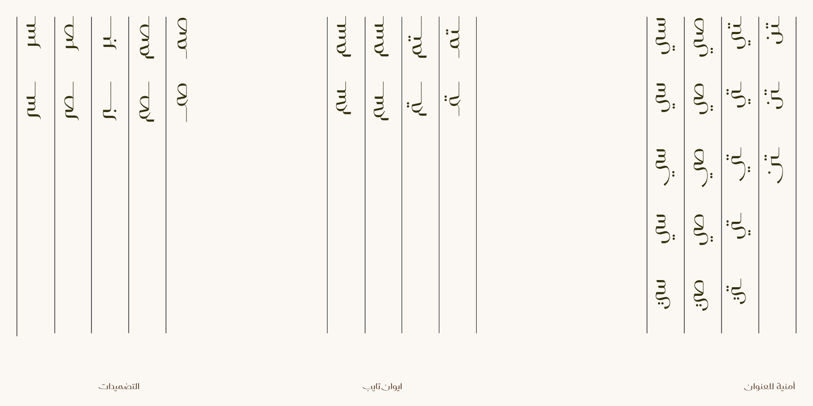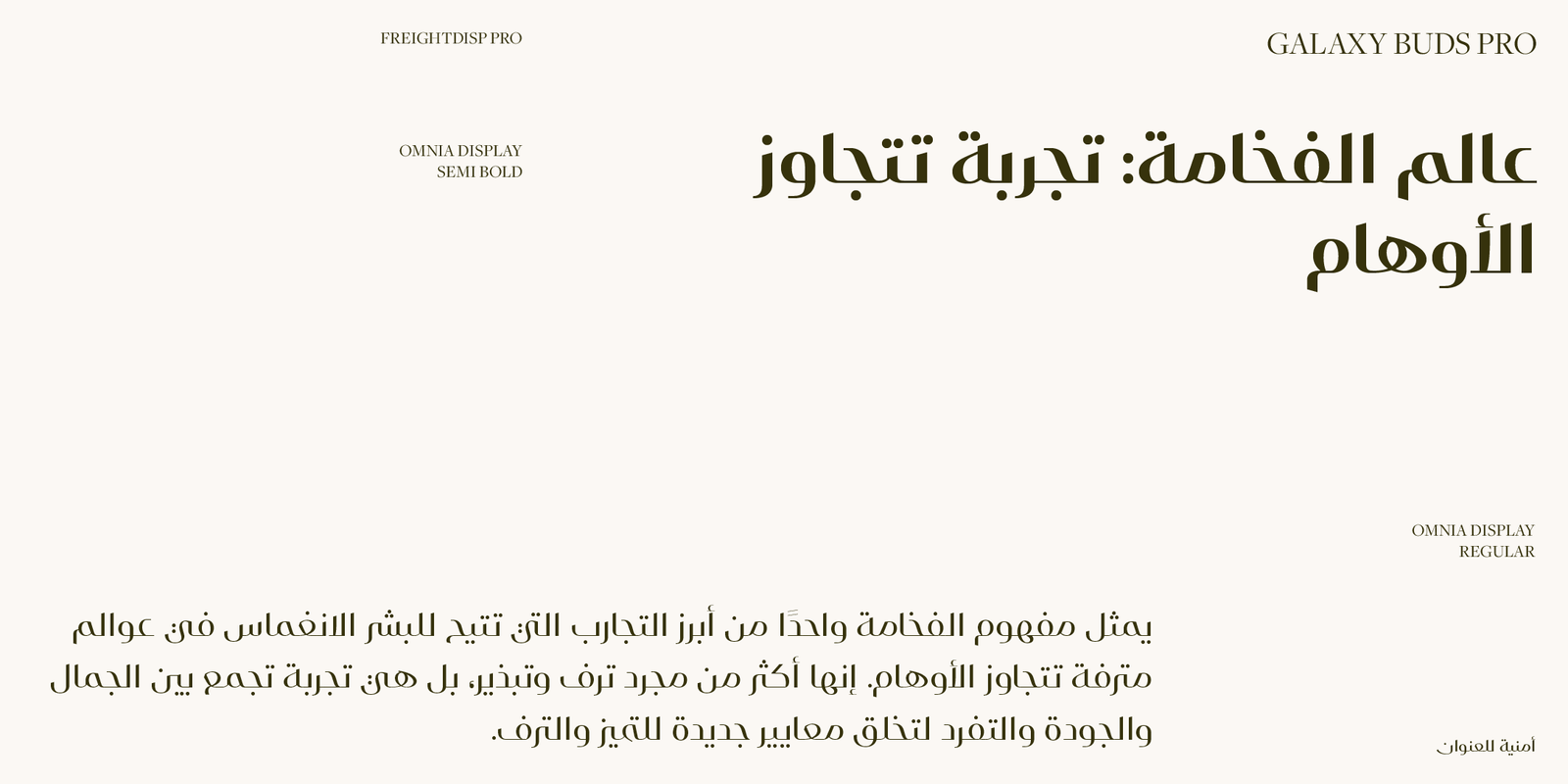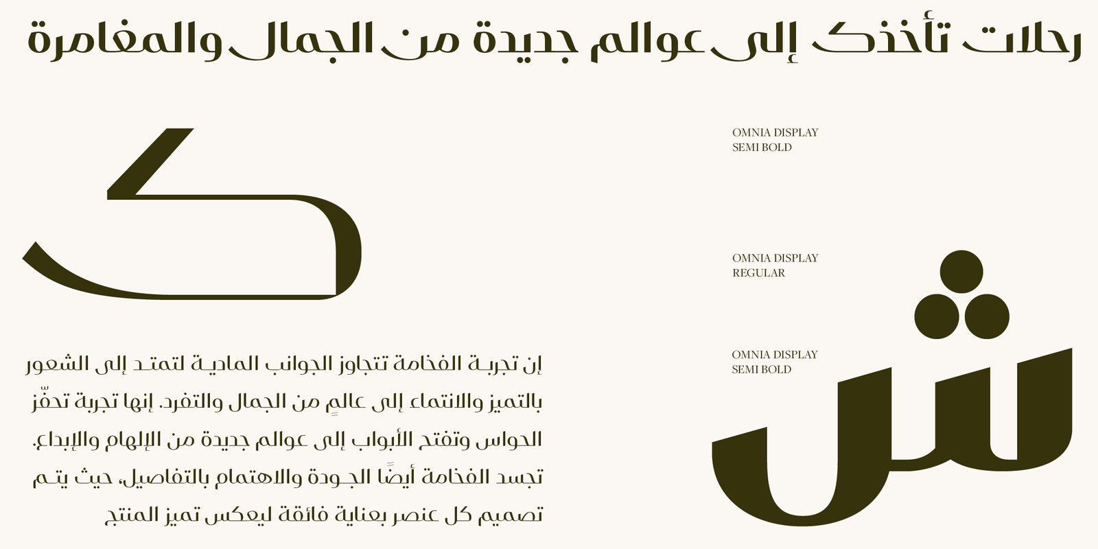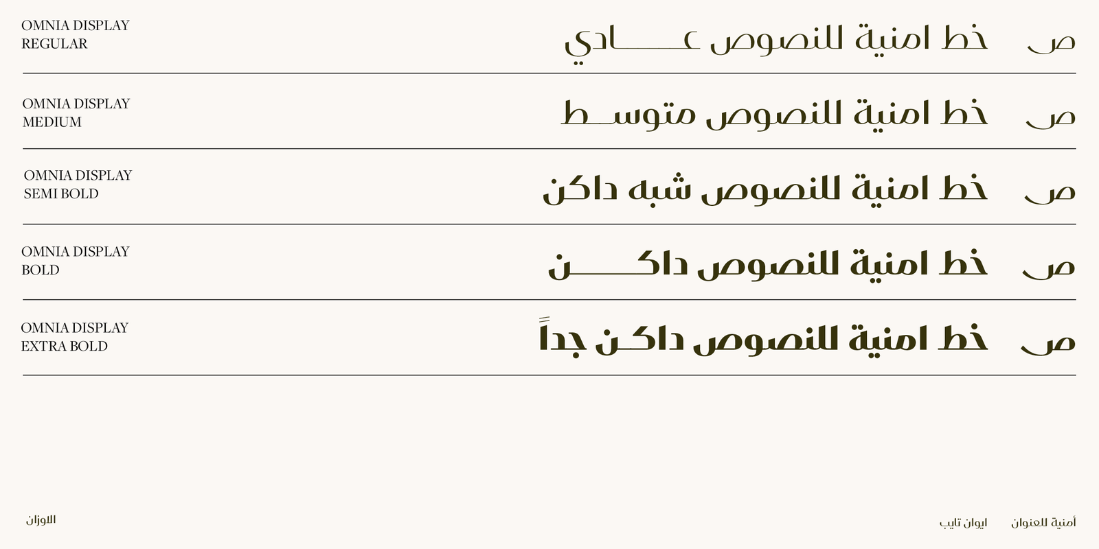 Omnia Arabic comes in five meticulously crafted weights, providing versatility and flexibility to adapt to any design context. Whether you seek a delicate touch in a light weight or a bold statement with a heavy weight, Omnia Arabic ensures that every visual representation maintains its charm and finesse.