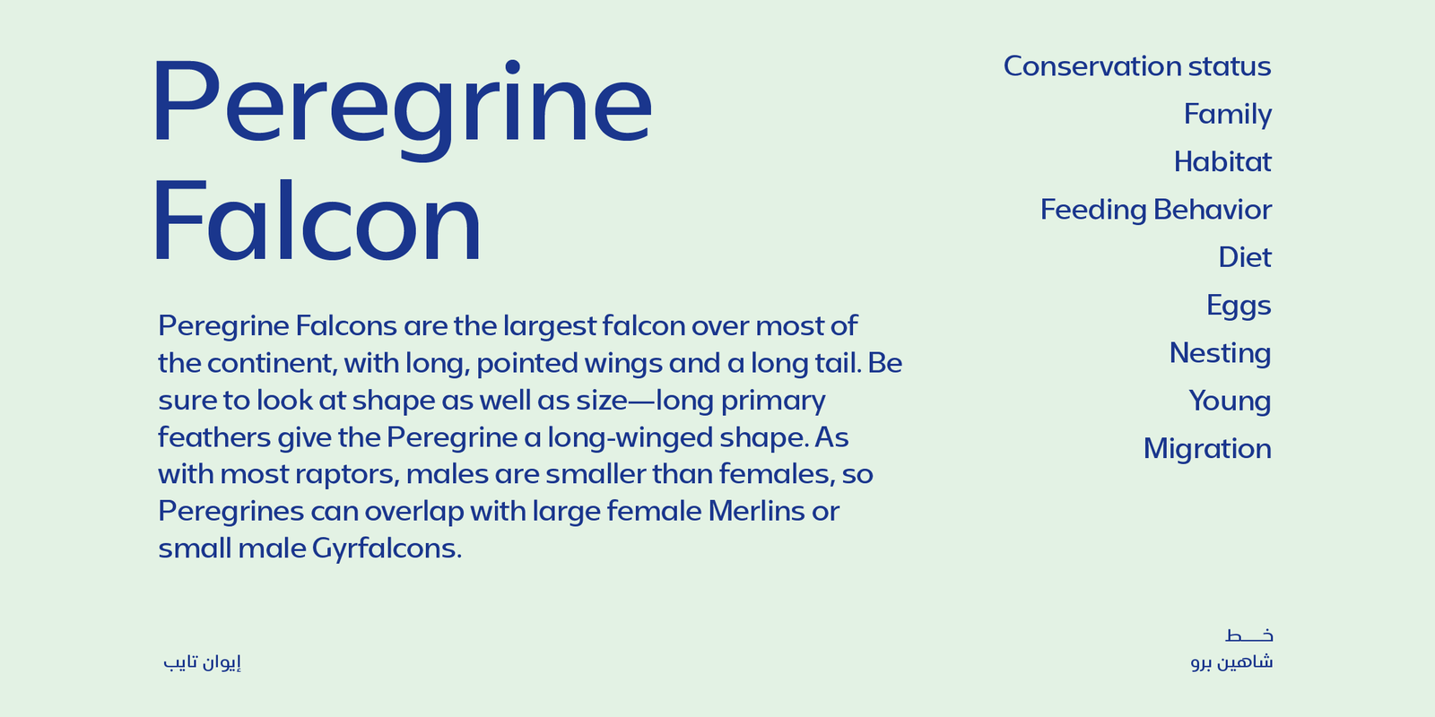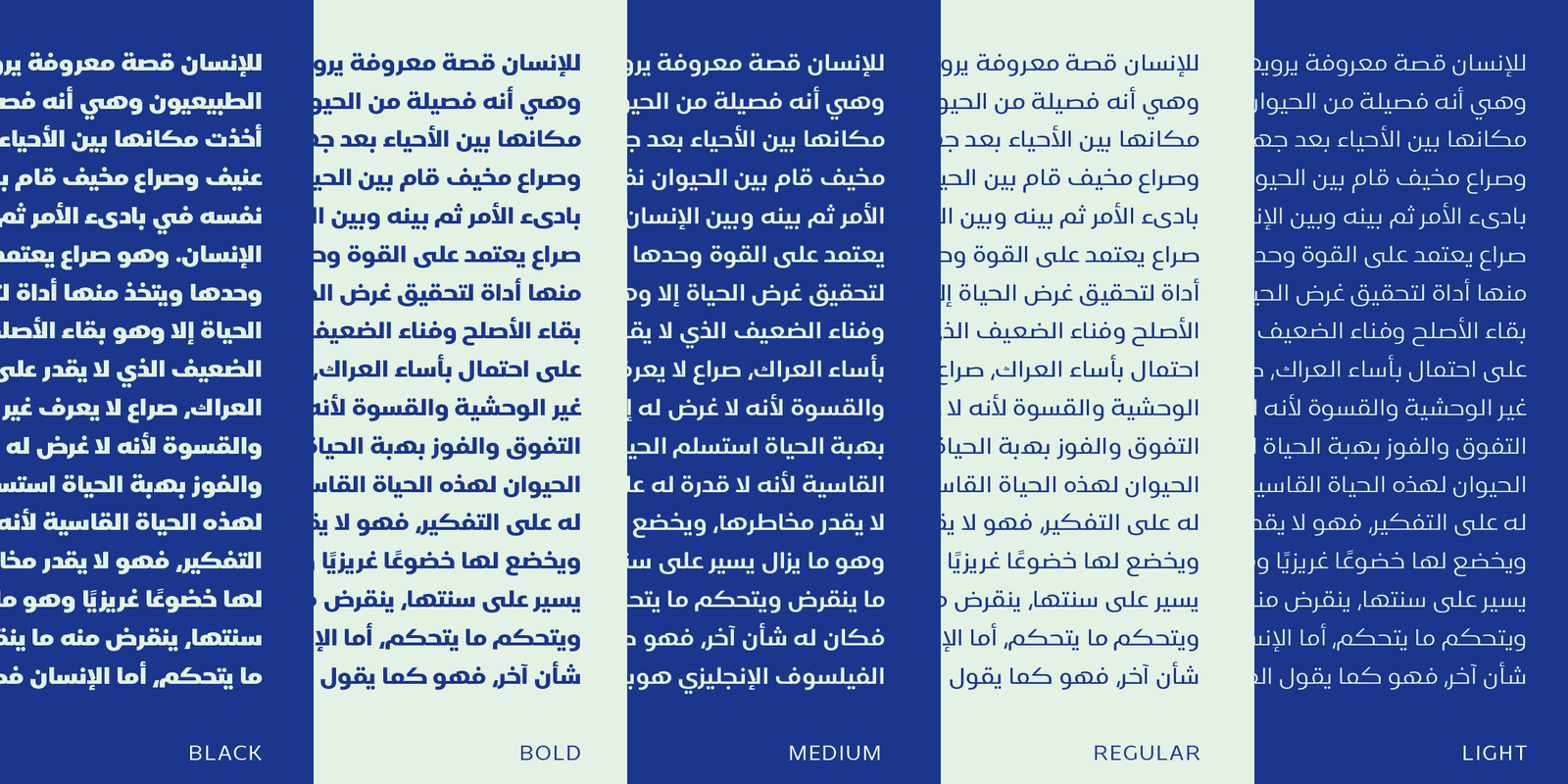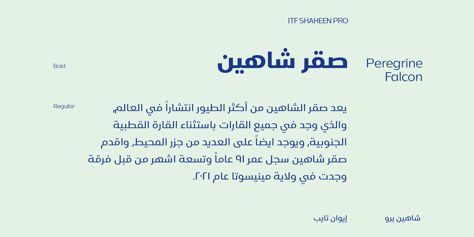 Shaheen pro is a version of Shaheen typeface, Shaheen pro is an Arabic and Latin typeface that embodies power and a tendency towards uniformity. While preserving the neat, minimalist look which is associated with it. The name, too, hints at the strong character of the typeface. Shaheen comes in 5 wights