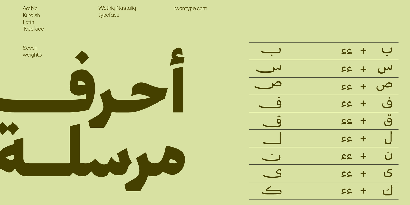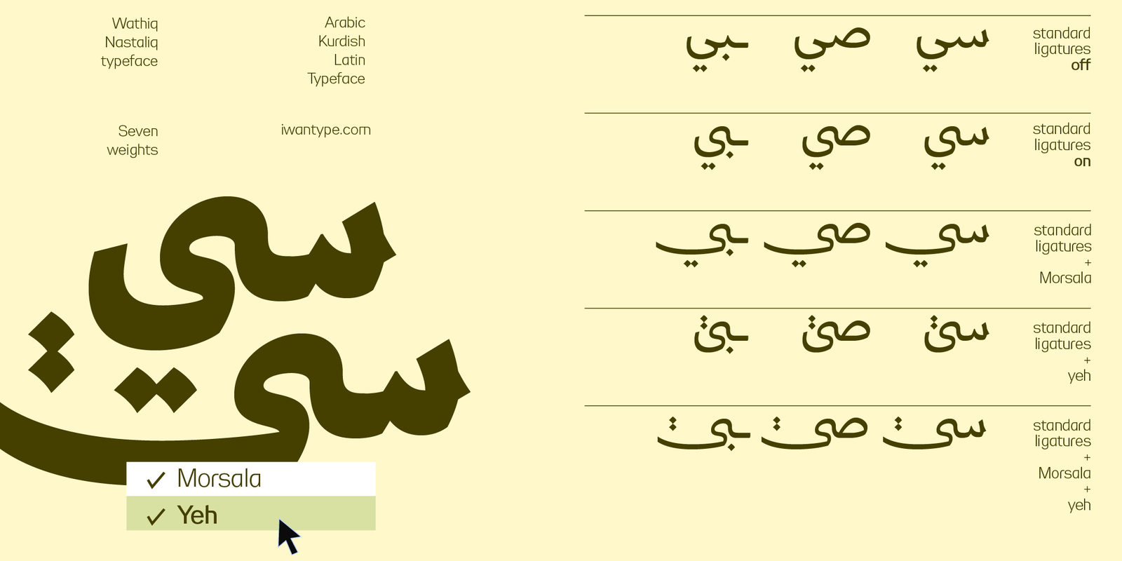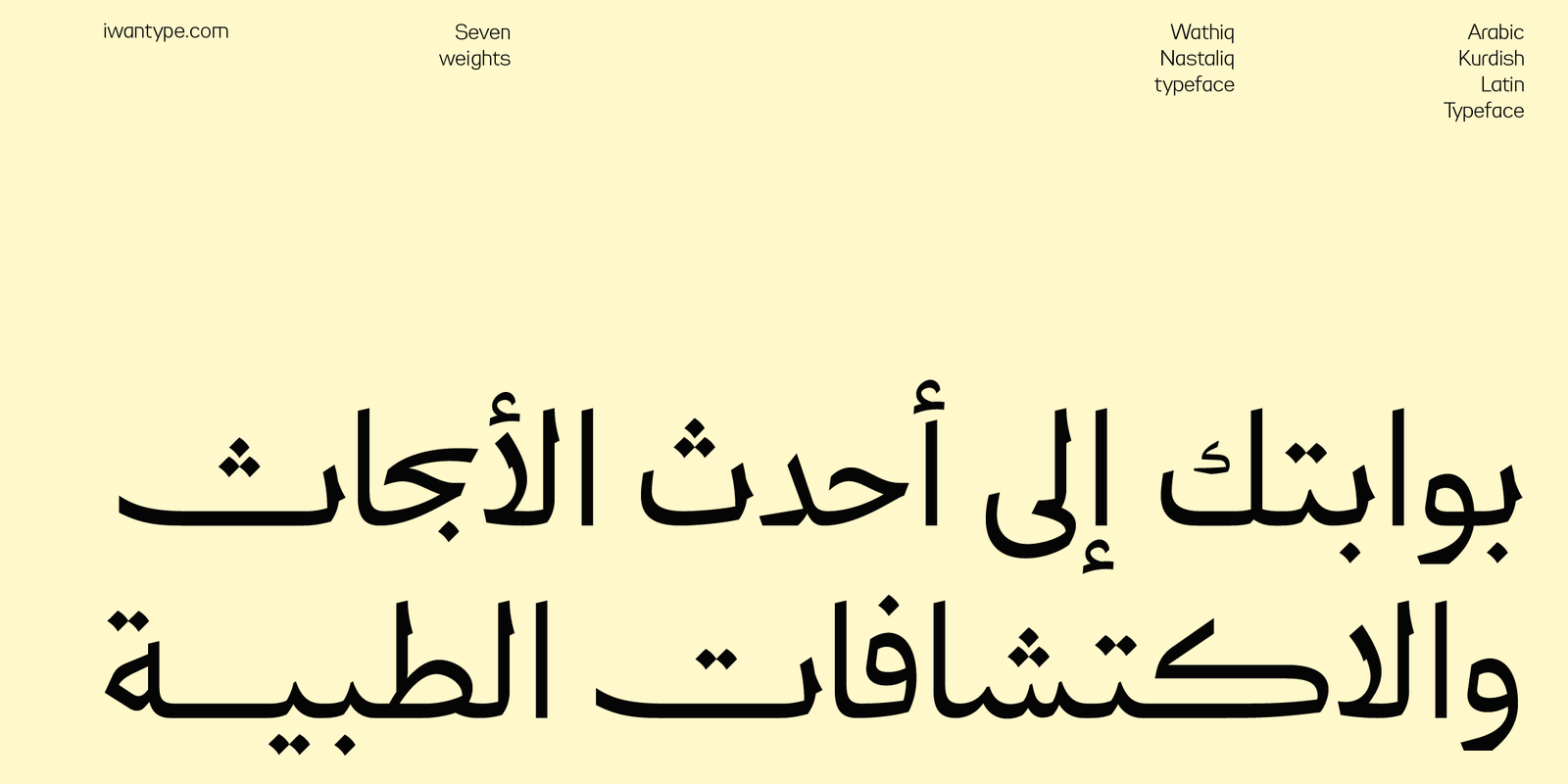يتميز وثيق نستعليق بانسيابية محسوبة تستلهم جماليات النستعليق دون محاكاتها التقليدية، فيما يحافظ على وضوح النسخ في بنيته الأساسية. النتيجة خط يتسم بالسلاسة والاتزان، مناسب للهويات البصرية والمشاريع الثقافية والإبداعية التي تحتاج إلى صوت طباعي معاصر وغير متكلف.