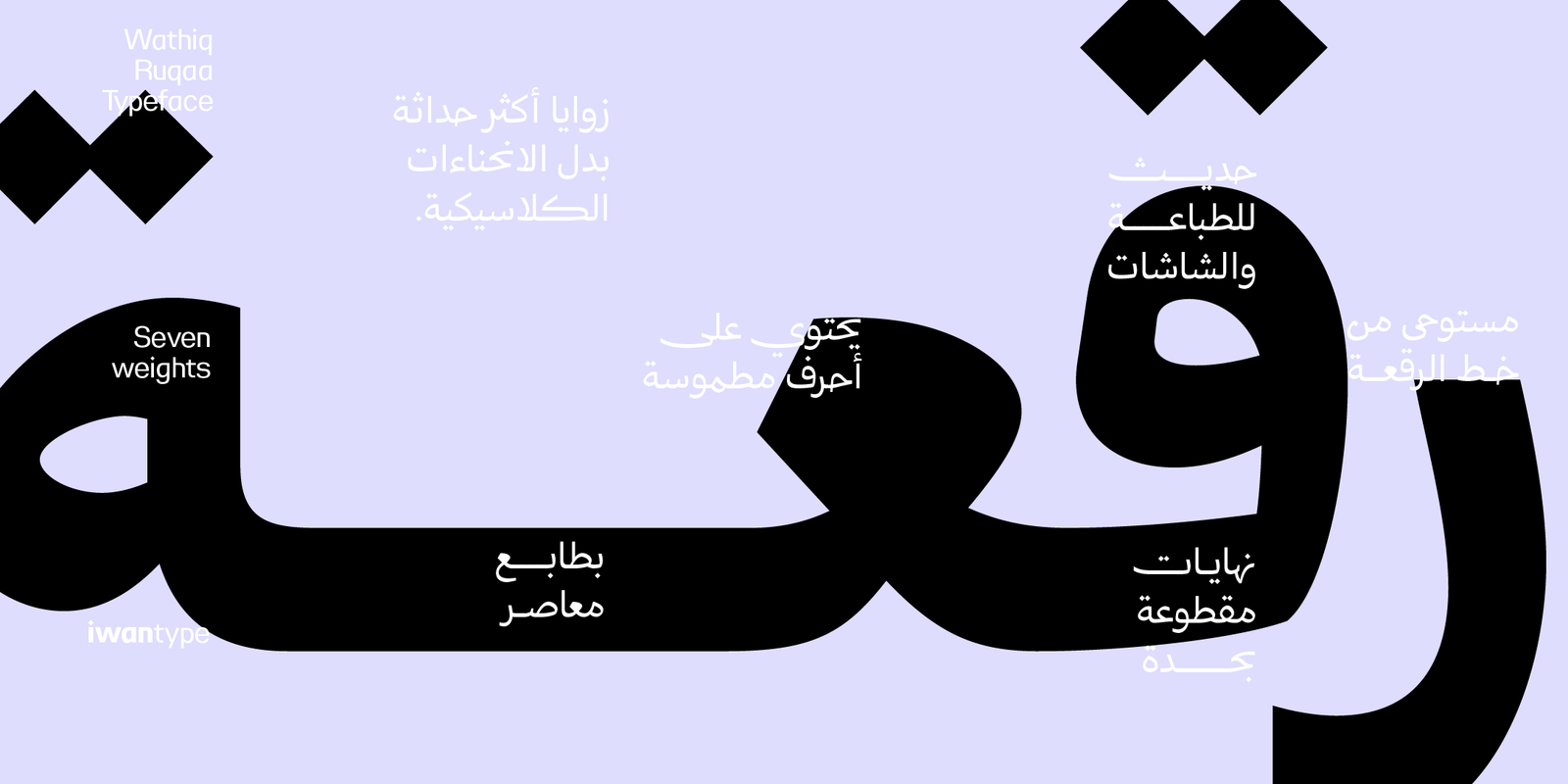 تم تطوير الخط ليجمع بين وضوح الرقعة التقليدي وسلاسة القراءة، مع بناء هندسي متوازن يمنح الحروف قوة بصرية وحضورًا واضحًا في العناوين والنصوص القصيرة.